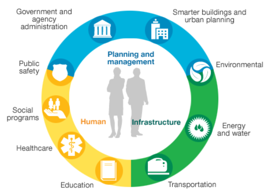Infraestrutura: A entrega de serviços, como por exemplo transportes públicos, faz de uma cidade mais desejada pelos cidadãos. Porém, manter a cidade pronta para a mudança constante, torna-se uma característica essencial. A IBM tem uma oferta de diversas soluções para as áreas de Energia, Ambiente e Transportes. Abaixo estão mencionadas algumas delas: