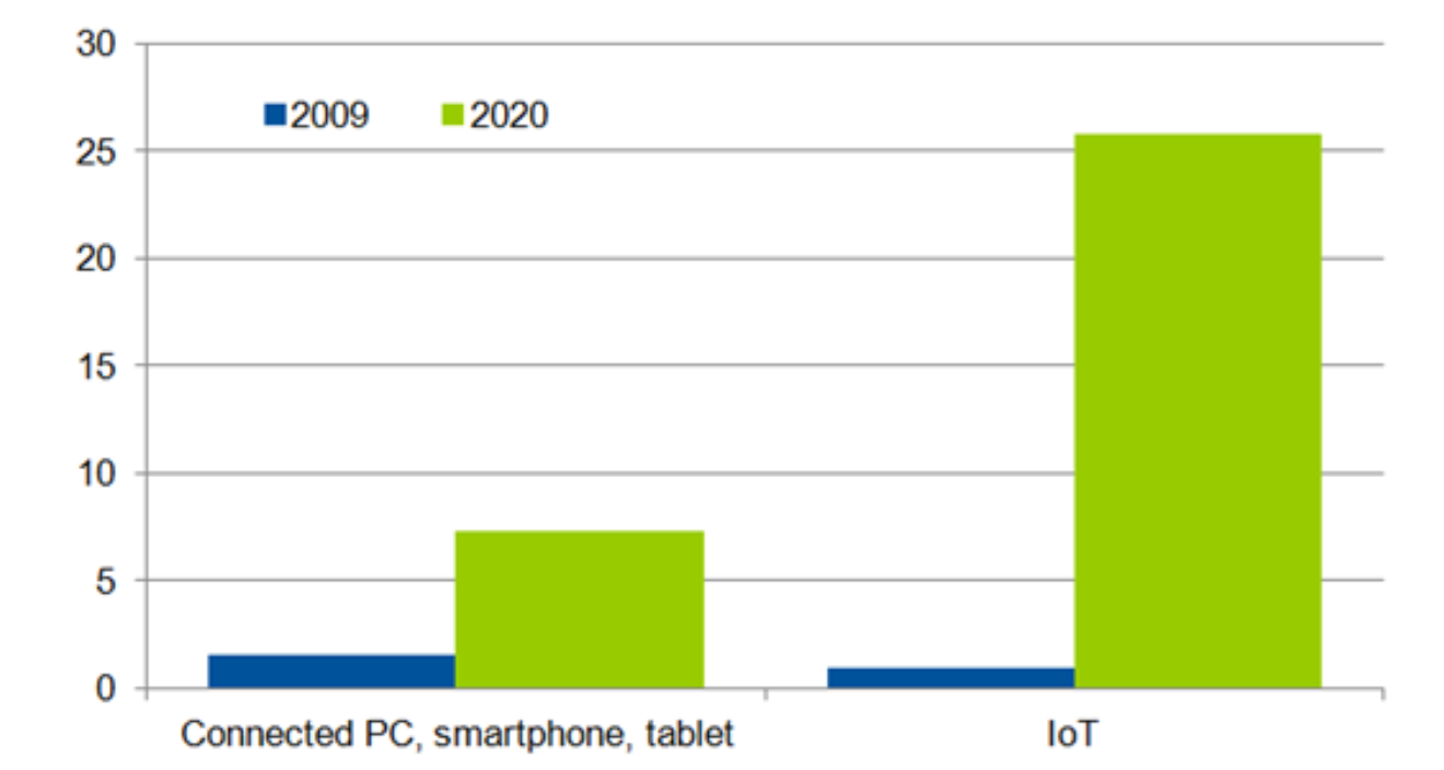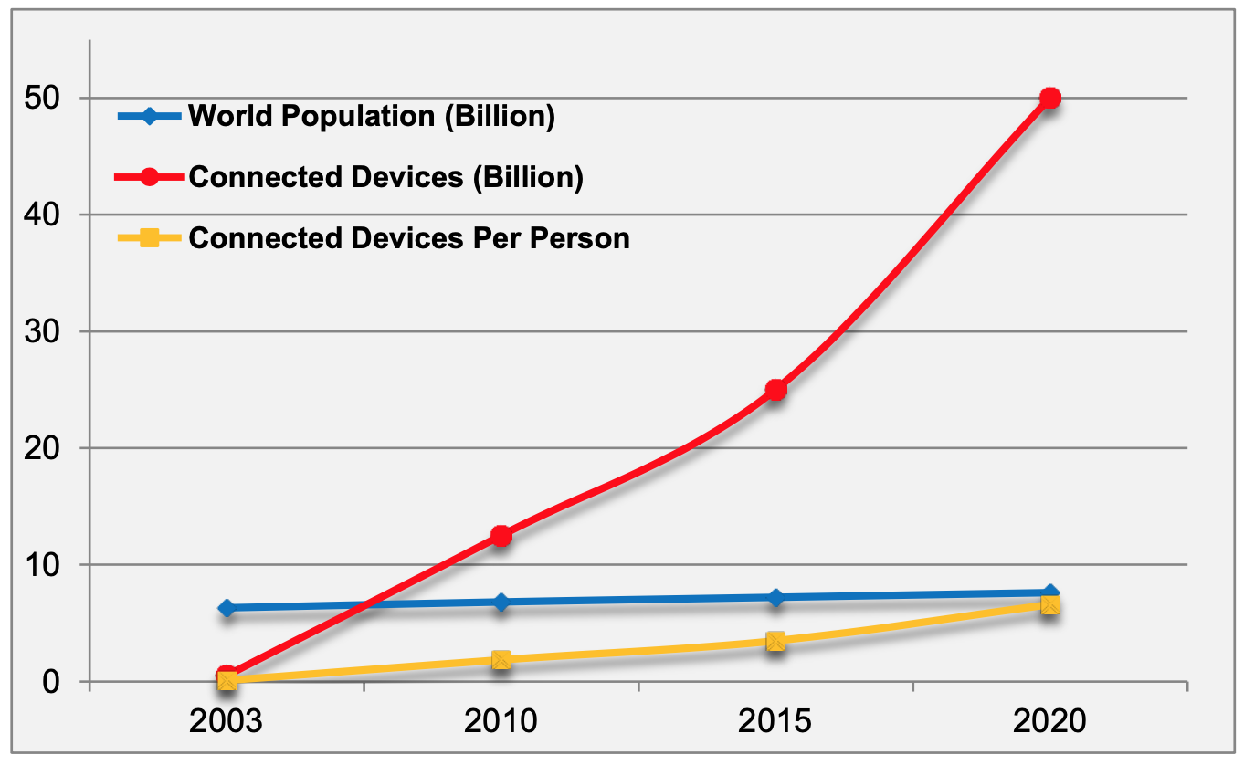 À medida que a Internet evolui, surge a necessidade de conectar mais objetos a este sistema global de comunicação. Segundo as previsões da Cisco, a Internet irá conectar cerca de 25 mil milhões de dispositivos em 2015, porém cerca de 1% dos objetos permanecem desligados na Internet. Em 2020, prevê-se que o número de objetos conectados à Internet será de 50 mil milhões (Figura 1).