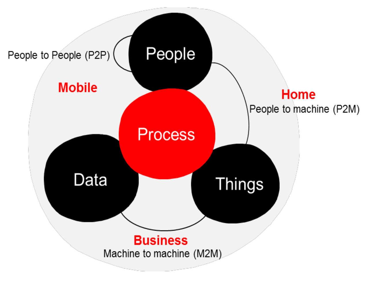 Processos: Esta componente tem um papel fundamental em como os três grupos acima referidos (Pessoas, Dados e Objetos) se interligam para entregar valor num mundo completamente conectado. Com os processos adequados, as ligações à Internet tornam-se mais valiosas porque a informação é entregue de maneira apropriada à pessoa certa no momento indicado.