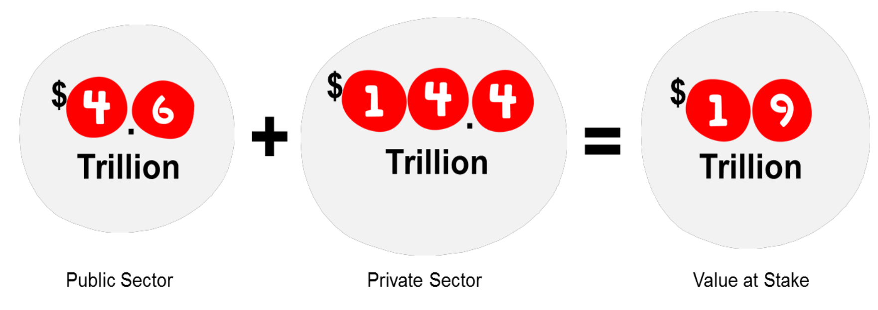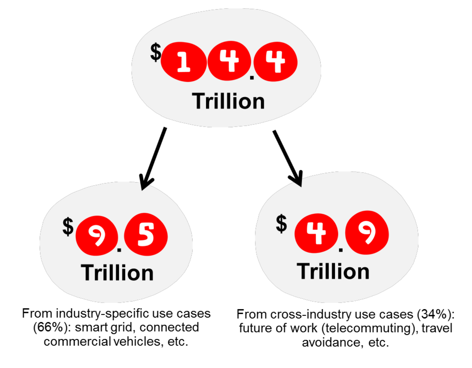 Existe uma oportunidade enorme em ligar objetos que ainda não estão conectados à Internet. A Cisco prevê que em 2020, 50 mil milhões de objetos estarão ligados a Internet e por isso estima que o valor mundial desta oportunidade será de 19 biliões de dólares. Este é o melhor valor, ou seja, o valor para o qual o rendimento é máximo e o custo mínimo. A investigação da Cisco indica que destes 19 biliões de dólares, 14.4 biliões estão associados ao sector privado e 4.6 biliões ao sector público (Figura 3).