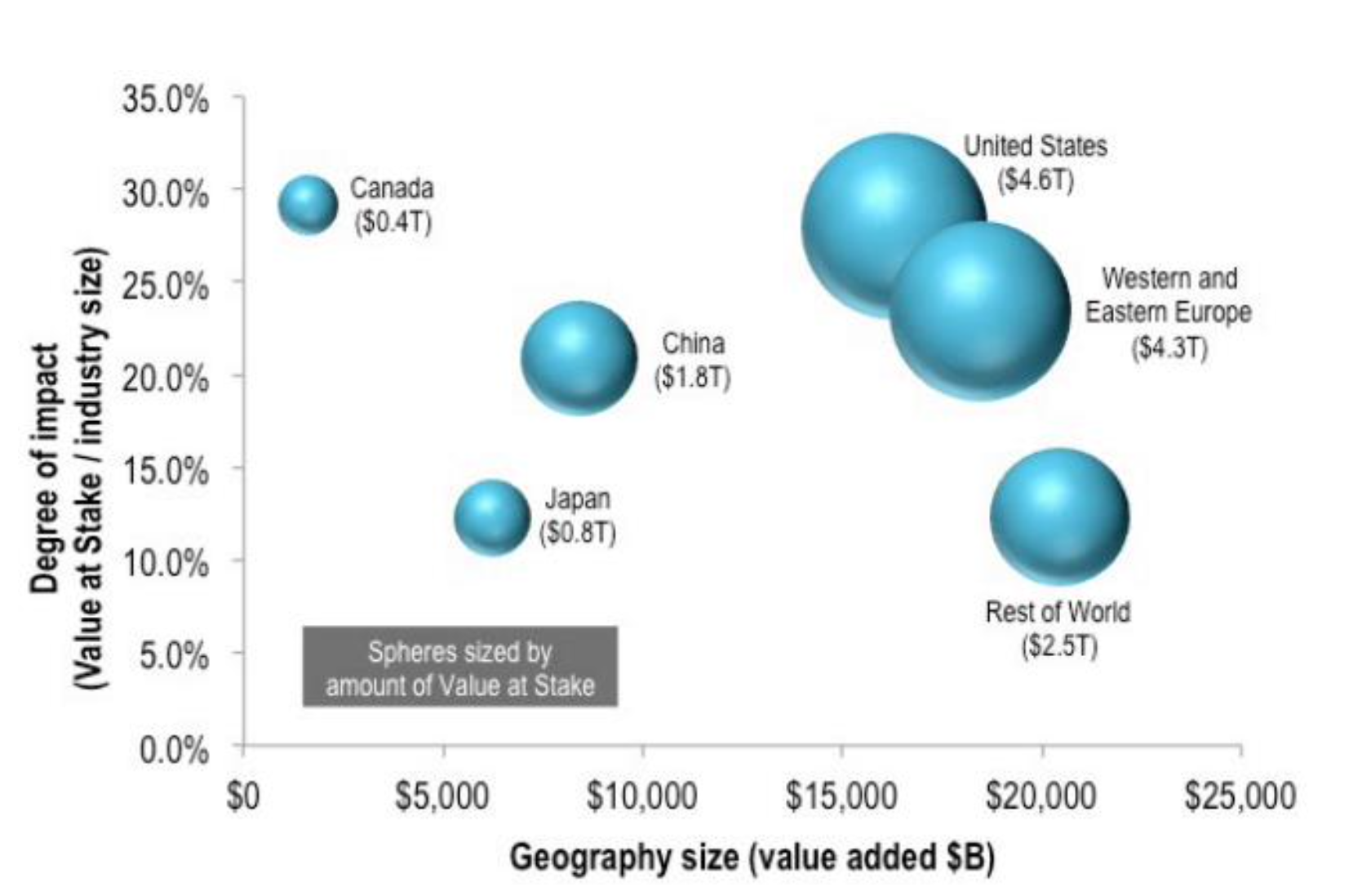 Outra análise realizada pela Cisco baseia-se no valor da oportunidade de acordo com a geografia. Analisando a Figura 5, denota-se uma distribuição dos 19 biliões de dólares pelas maiores regiões. Também se pode verificar o grau do impacto por cada região que é determinado pela divisão do valor em jogo pelo tamanho da indústria. Os factores que estimulam estes valores baseiam-se no crescimento relativo da economia de cada região e pelo tamanho relativo de cada indústria em cada região. Como exemplo, nos EUA e na EU as oportunidades são mais predominantes no sector de serviços.