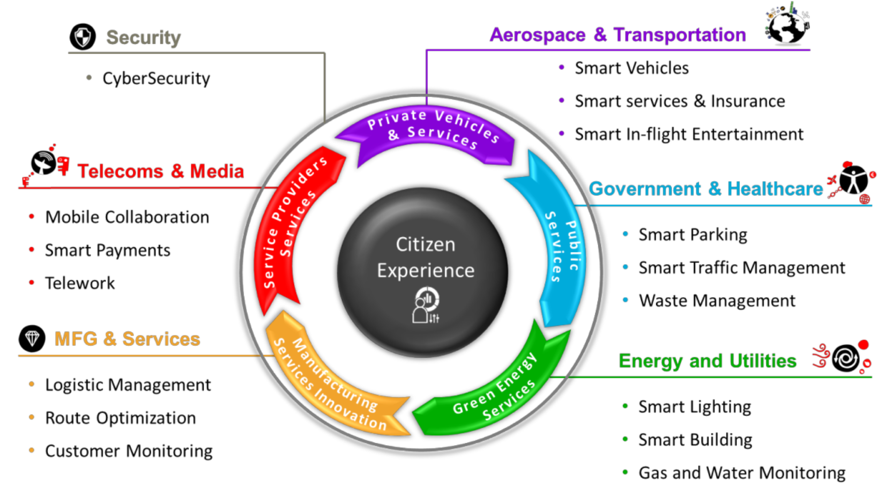Aerospace and Transportation – área que integra todos os transportes privados terrestres, náuticos e aéreos. Tem-se como exemplo de serviços Smart Vehicles no qual veículos comunicam entre si e entre si e a infraestrutura permitindo que os carros criem uma rede móvel de comunicação designada por VANET (Vehicular Ad-hoc Network) que possibilita o acesso à Internet. Os condutores e passageiro irão usufruir de maior comunidade, menos tempo despendido no trafego através do cálculo de melhores rotas e de uma experiencia de entretenimento através do acesso a conteúdos multimédia atualizados. A forma como as diferentes empresas irão alavancar negócio através da distribuição e comercialização de serviços e aplicações em redes veiculares apresentará por si só um tremendo desafio. Os modelos de negócios devem ser rentáveis para as operadoras de telecomunicações e os serviços devem prezar por preços acessíveis e atraentes. Para tal, deve haver sistemas de pagamentos e mecanismos de contabilidade especiais baseados na rapidez e flexibilidade. Nos aviões poderão existir mecanismos de interação entre os smartphones e os sistemas de entretenimento.