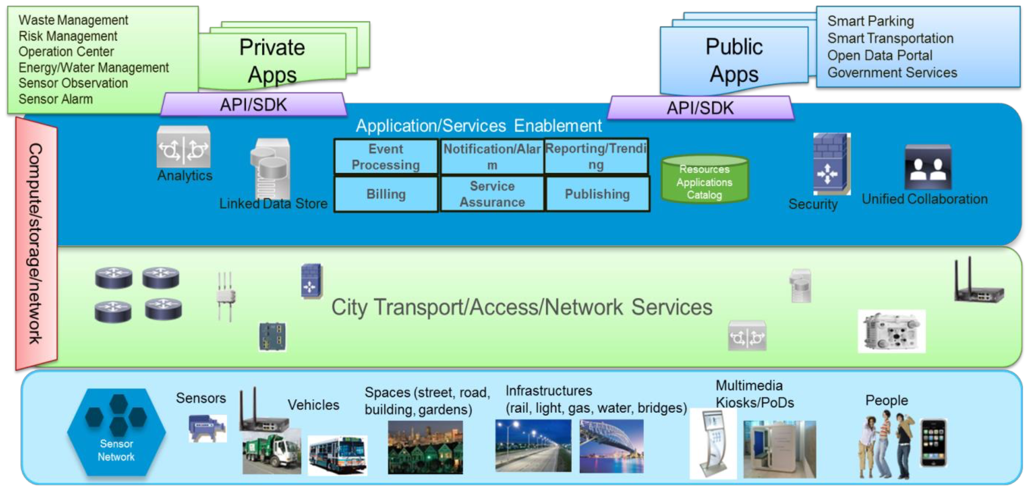 Algumas cidades estão a explorar o desenvolvimento de infraestruturas horizontais de múltiplos serviços, que irão albergar todos os sistemas da cidade. Estas abordagens são desenhadas para facilitar a integração de novas aplicações que normalmente requerem instalação nos dispositivos terminais. Garantir que os custos de implementação de futuros serviços são mínimos e que haja disrupção da atual arquitetura de rede são os objetivos que se pretende atingir com a proposta de uma arquitetura de referência. A eficácia desta arquitetura de referência será determinada por diversos factores, dos quais salientamos a conexão das pessoas com as máquinas e sensores nas cidades; a recolha segura em tempo real de dados e posteriormente o seu armazenamento e por fim, analisar os dados e identificar padrões, de modo a prever tendências de mercado. Deste modo, a arquitetura de referência deve ser capaz de gerir milhões de dispositivos e sensores, milhares de servidores, transmissão multidimensional, processamento e streaming de grandes quantidades de dados. Apesar disto, a infraestrutura necessita de processar os dados, detetar a tendência e tomar decisões na extremidade da rede. Numa primeira análise, uma solução para os superar poderia passar por aumentar o poder de processamento a atual arquitetura de rede. Contudo, para atingir os objetivos acima mencionados, uma nova arquitetura é necessária. A cidade de Nice, através do serviço piloto de Smart Parking, propôs uma arquitetura. Ver Figura 7.